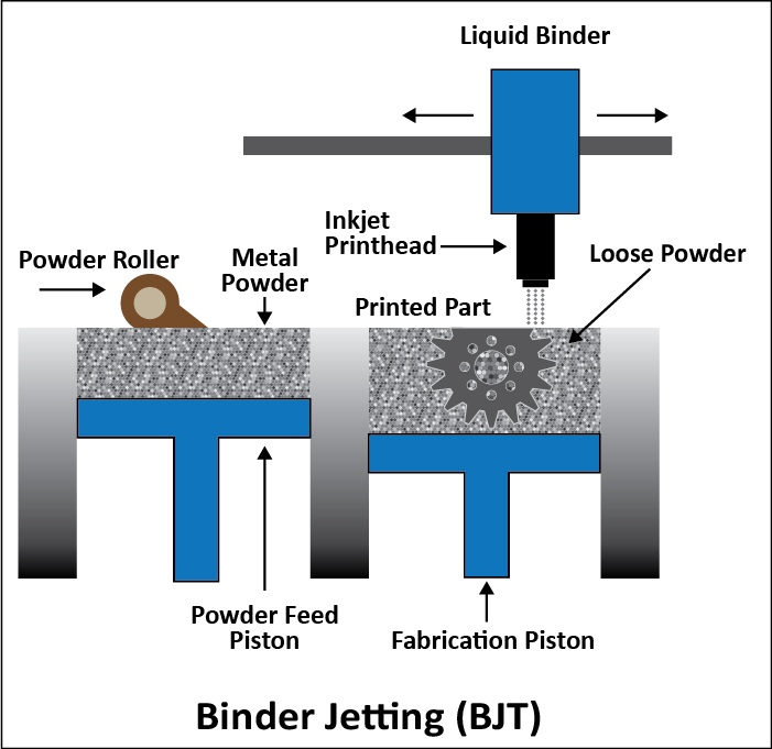 Binder jetting technology (BJT) utilizes a printhead to selectively deposit a liquid binding agent onto a thin layer of powder particles, forming a loosely bound “green part” to be sintered later in a furnace. BJT may utilize metals, ceramics, or composites to build components. The process begins with a 3D CAD model which is numerically sliced into discrete layers. The printhead selectively deposits a binder to the powder, layer by layer, until the components are complete. After printing, metal BJT parts require debinding and sintering to consolidate the material into a near full density geometry. BJT is used when increased throughput or increased print area is required. BJT generally utilizes standard MIM powders.